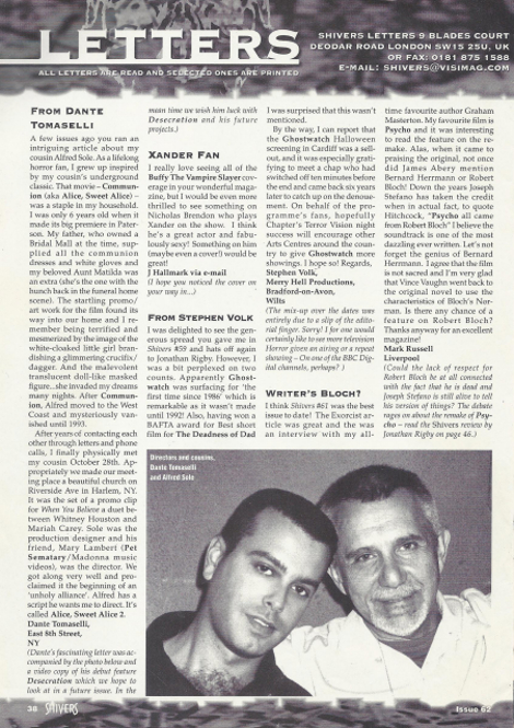 "Dante Tomaselli is one of most visually striking directors working in the horror genre these days. An independent director, working with small budgets, he has repeatedly shown that atmosphere, vision and style are often more important than costly, over-the-top effects to tell a scary story."